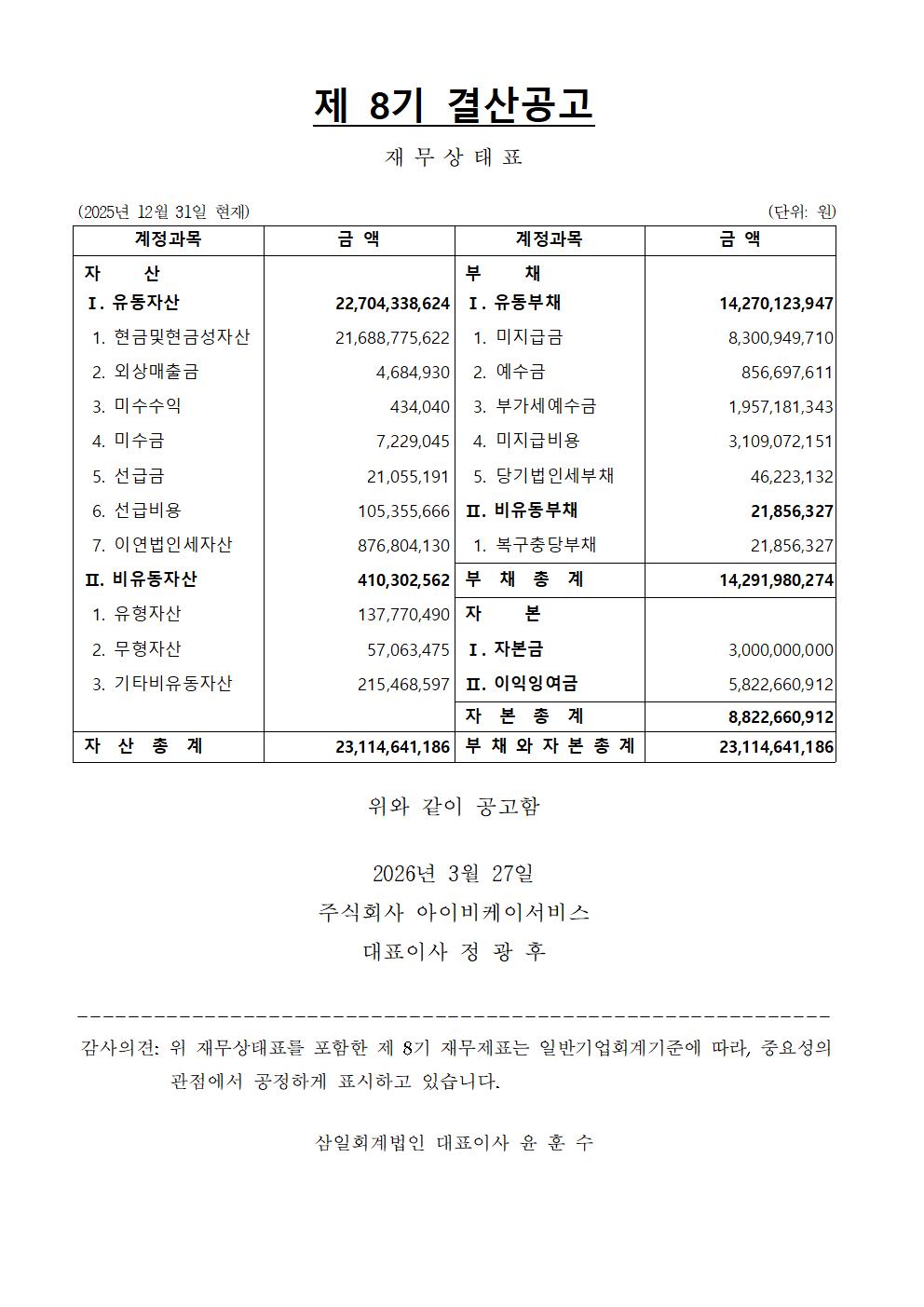 [경영공시 : 결산공고] 2025년(제8기)