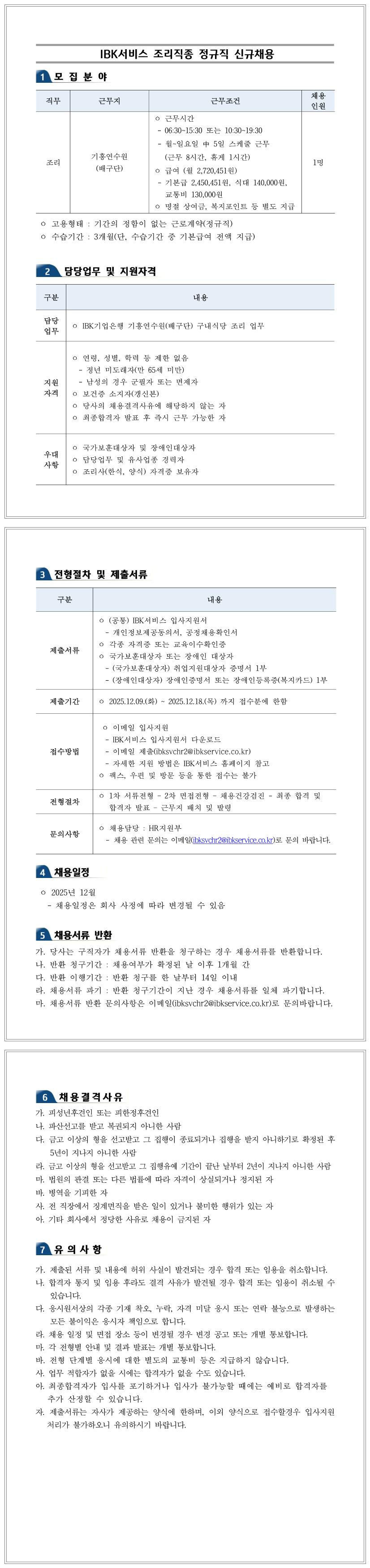 IBK서비스 조리직종(조리원) 정규직 신규채용(IBK기업은행 기흥연수원 배구단)